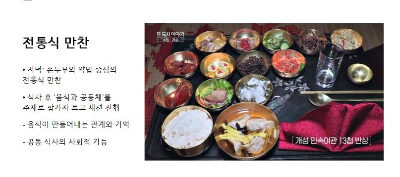 셋째 날 일정은 ‘국제도시 개성, 그리고 문화교류’라는 주제 아래, 개성을 역사적 도시이자 오랜 시간 문화가 교차해 온 공간으로 이해하는 데 초점을 두고 구성했다. 특히 개성공단과 같은 현대적 공간과 고려궁터, 왕건릉과 같은 역사적 공간을 함께 아우르는 동선을 마련해, 개성이 축적해 온 문화교류의 층위를 입체적으로 살펴볼 수 있도록 했다. 또한 개성민속여관에서 전통식 13첩 반상을 체험하는 시간을 통해, 공동체 형성 과정에서 음식이 수행해 온 역할과 그 의미를 함께 살펴보도록 했다.