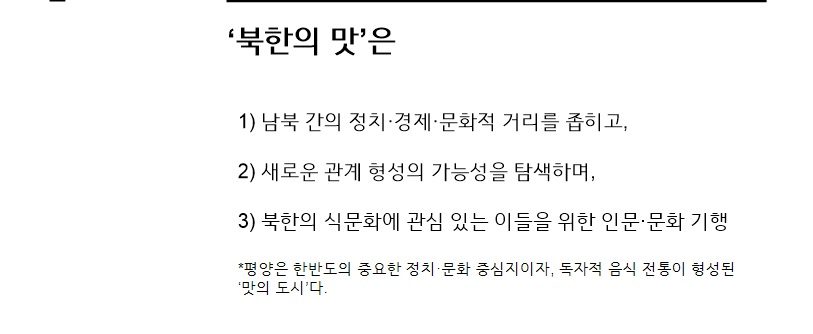 우리민족서로돕기운동이 주관한 ‘평양·개성탐구학교’는 북한을 낯설고 이질적인 공간이 아니라, 일상의 장소로 다시 바라보고자 한 시도였다. 특히 마지막 순서로 진행된 ‘평양·개성 여행 기획하기’는 그동안의 강의 내용과 참가자들의 의견을 바탕으로, 우리가 어떤 시선으로 북한을 이해하고 어떤 방식으로 이야기할 수 있을지를 하나의 구체적인 여행 일정으로 풀어내는 작업이었다. 이 과정에서 우리는 그동안 생소하게 느껴져 온 북한을 음식이라는 익숙한 매개를 통해 탐구하는 데 목적을 두었다.