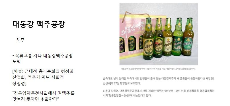 오후에는 대동강맥주공장 견학을 통해 평양의 근대적 음식문화와 소비 양상, 그리고 여가와 취향의 변화를 살펴보는 일정으로 이어지도록 했다. 이를 통해 북한의 음식문화가 단일하고 고정된 이미지로만 이해될 수 없음을 직접 체감하도록 했다. 저녁에는 대동강수산물시장을 포함해 현지식 송어회 정식을 계획함으로써, 평양의 일상 식문화와 지역 식재료가 지닌 특징을 보다 가까이에서 느낄 수 있도록 하루 일정을 마무리했다.