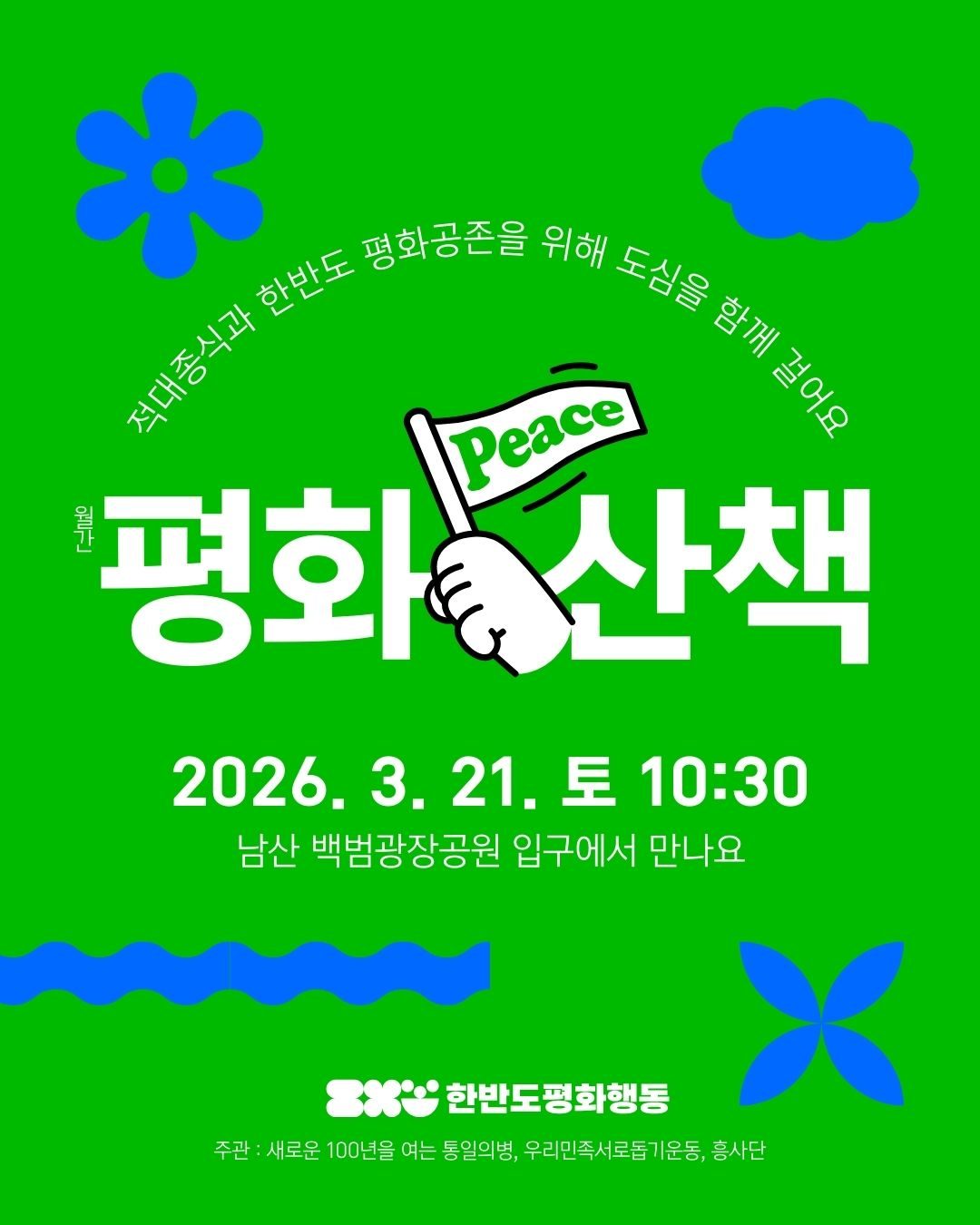 하지만 이대로 두고만 볼 수는 없어요. 이 땅에 모든 전쟁이 즉각 중단되고, 한반도 또한 남북의 소모적인 적대적 대결의 악순환을 멈추고, 평화가 공존하는 세상을 만들기 위해 한반도 평화행동은 더 많은 시민들과 함께 평화를 이야기 하는 자리로 <월간 평화산책>을 진행합니다.