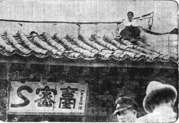 사진 설명: 을밀대 지붕 위에 올라간 강주룡. (출처: 국사편찬위원회 한국사데이터베이스/문화체육관광부 국립중앙도서관 홈페이지)