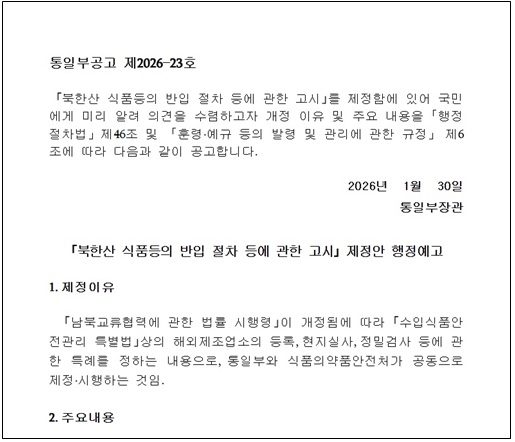 사진 설명: 「북한산 식품등의 반입 절차 등에 관한 고시」에 대한 통일부 공고(출처: 통일부)